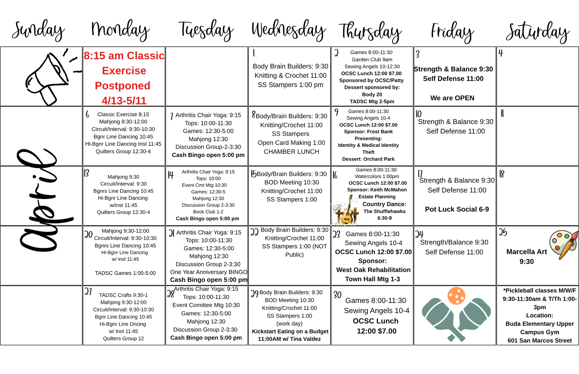Onion Creek Senior Center hosts a variety of programs for its members and the surrounding community. Check out this month’s calendar below. Visit the Activities & Events Page to read details on all programs. Learn about the benefits of becoming a member on our Membership Page.